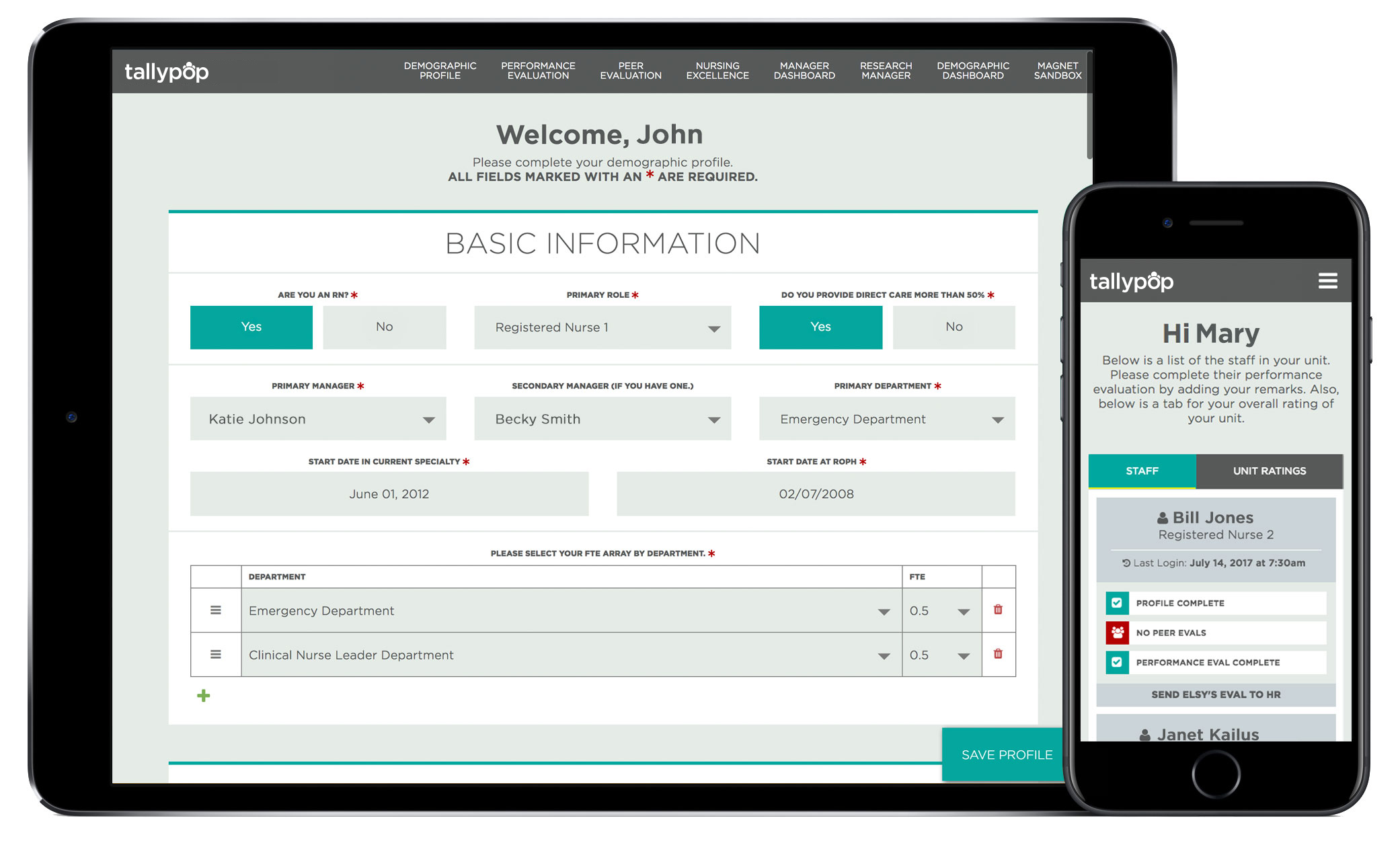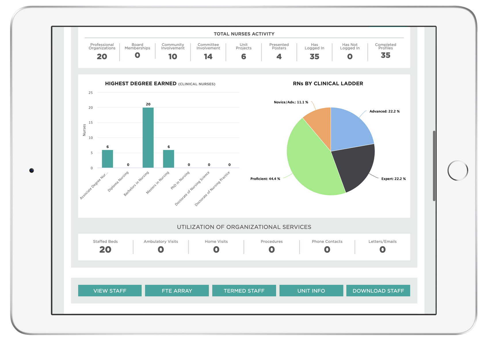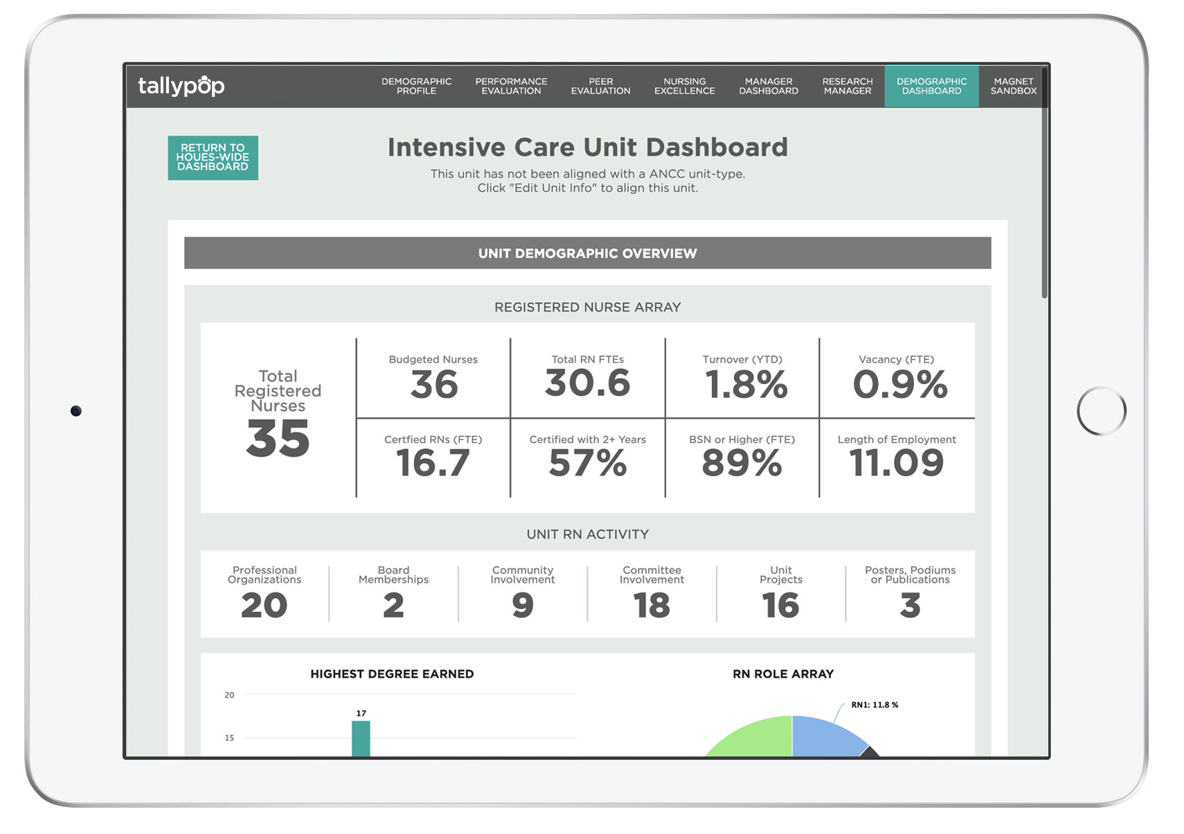Tallypop features a unique login for each nurse or staffer working in a hospital. Each nurse logs in and provides data that can be hard to track such as education, certification, projects, fellowships, board membership, committee involvement, community work and anything else that is important to your organization. The data is processed, tallied and reported to dashboards for the Nursing Leadership team and hospital leadership to use for reports and operations.