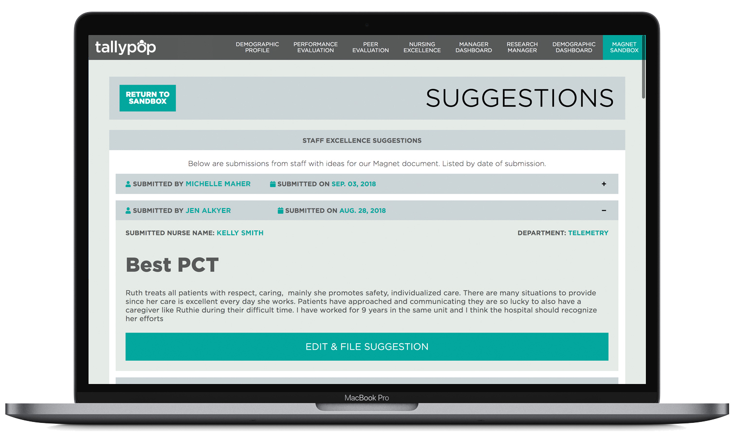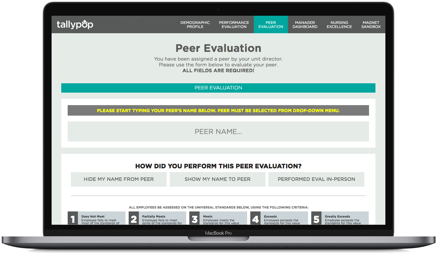 Tallypop refocuses performance evaluations towards nursing excellence and away from the basics that HR departments require. Your Profession Practice Model can be the center the evaluation process. Peer evaluation functionality streamlines each nurse’s ability to evaluate their peers. After the evaluation process is complete, the TallyPop bundles up a PDF and sends it off to the HR departments.