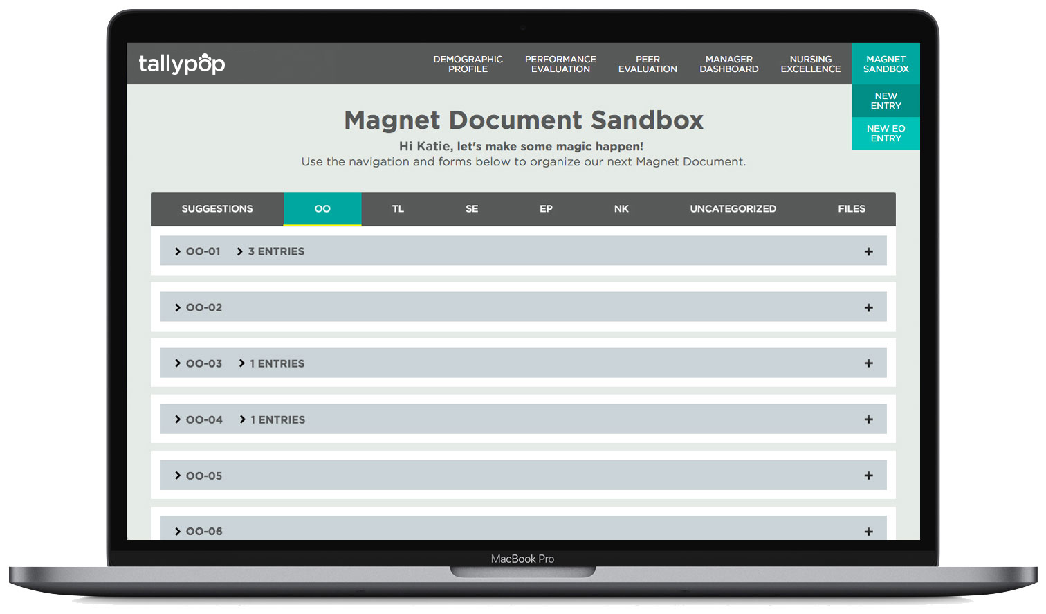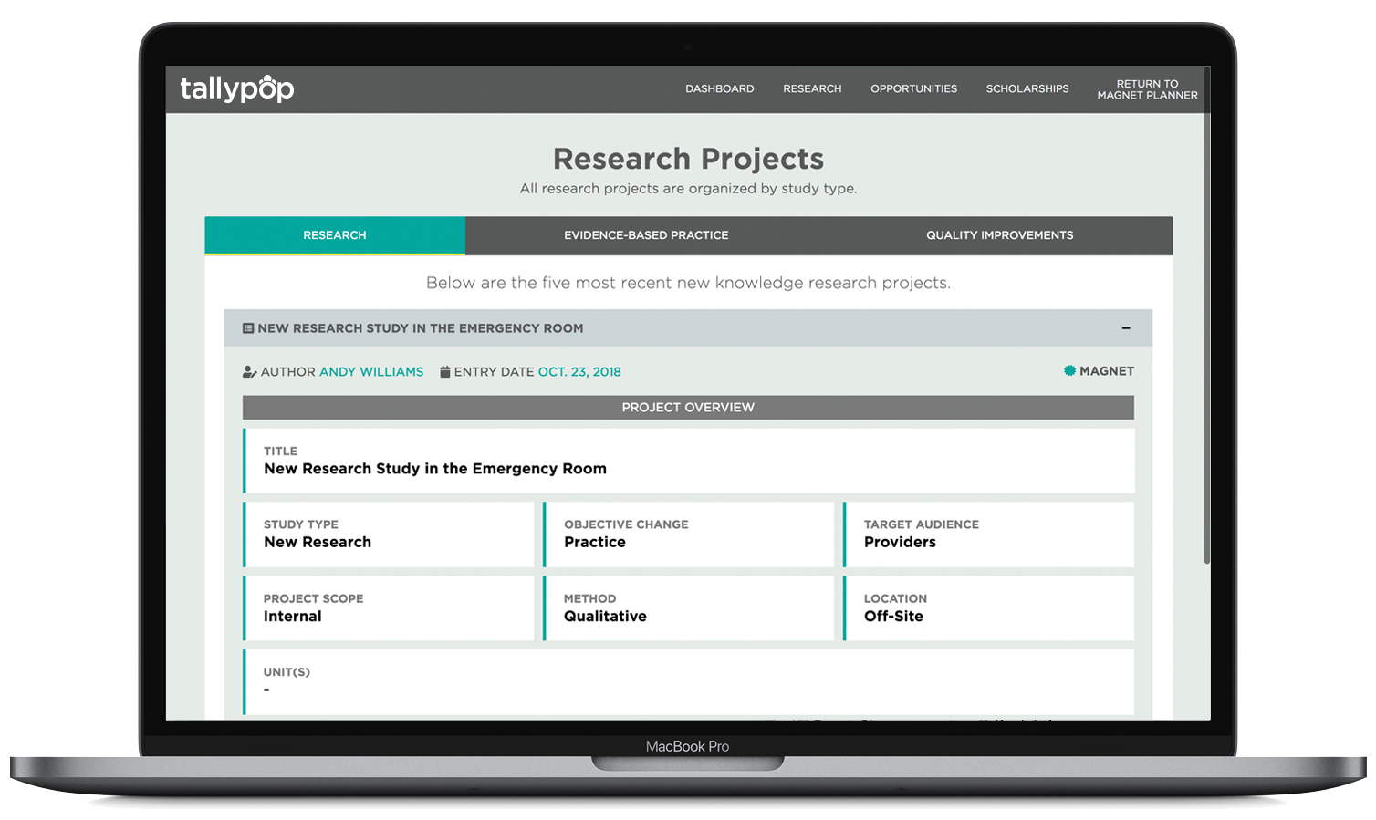Gone are the days when nursing administration had to wonder if they harnessed and recorded all of their nursing staff’s activity. Tallypop creates a place where all research projects, inward-facing educational activity and outward-facing scholarship activity can be tracked and managed. Each project or activity can be marked as Magnet Document eligible, making OO-10 as easy to produce as a simple click of the mouse.
